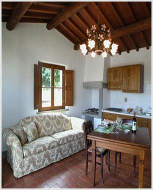 Spazioso villino bilocale libero su due lati ubicato di fronte alla dimora storica con piccolo spazio esterno e con vista sulle bellissime colline circostanti. Arredato in stile rustico toscano l'ampio soggiorno è dotato di un confortevole divano letto matrimoniale e di una cucina accessoriata. Un'ampia entrata ad arco con porta finestra conduce al proprio spazio esterno. Dal salone si accede, alla spaziosa camera da letto matrimoniale ed al bagno con doccia rifinito con le tipiche maioliche toscane bianche e blu.